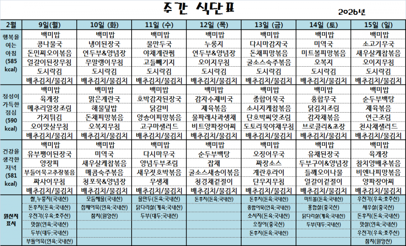 26.2.9(월)~26.2.15(일)_식단표_ 페이지 정보 작성자 관리자 작성일26-02-09 10:13 조회12회 댓글0건 다음글 목록 본문 *식단은 시장수급사정 또는 업체상황에 의해 변경될 수 있습니다.* 댓글목록 등록된 댓글이 없습니다. 다음글 목록
