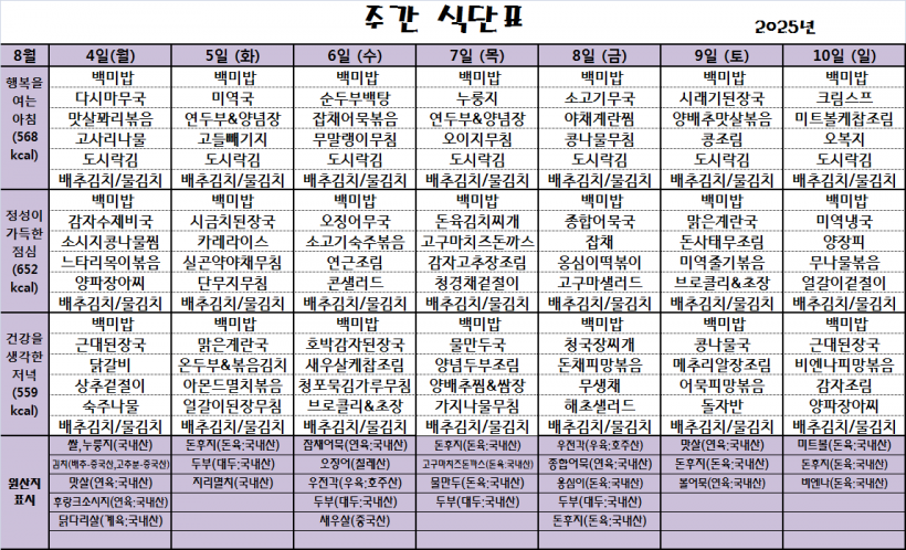 25.08.04(월)~25.08.10(일)_식단표_ 페이지 정보 작성자 관리자 작성일25-08-04 09:52 조회199회 댓글0건 이전글 다음글 목록 본문 *식단은 시장수급사정 또는 업체상황에 의해 변경될 수 있습니다.* 댓글목록 등록된 댓글이 없습니다. 이전글 다음글 목록