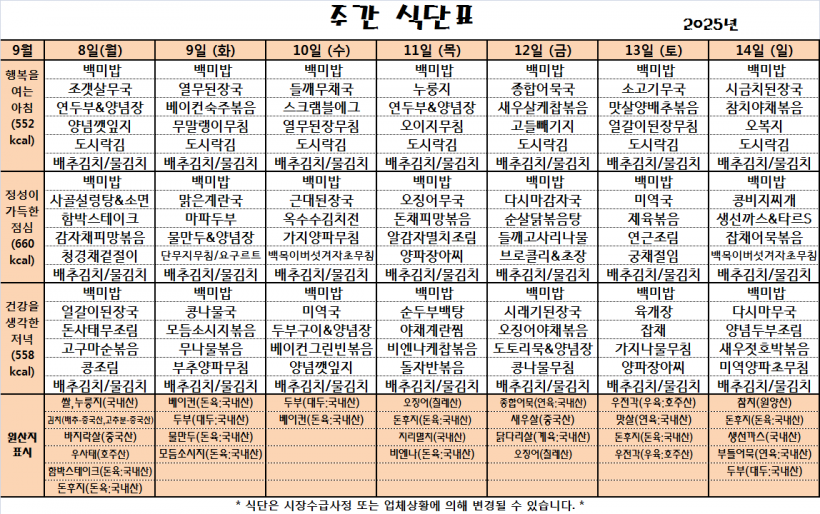 25.09.08(월)~25.09.14(일)_식단표_ 페이지 정보 작성자 관리자 작성일25-09-08 09:47 조회182회 댓글0건 이전글 다음글 목록 본문 *식단은 시장수급사정 또는 업체상황에 의해 변경될 수 있습니다.* 댓글목록 등록된 댓글이 없습니다. 이전글 다음글 목록