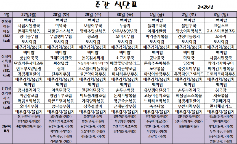 26.04.27(월)~26.05.03(일)_식단표_ 페이지 정보 작성자 관리자 작성일26-04-27 09:58 조회3회 댓글0건 다음글 목록 본문 *식단은 시장수급사정 또는 업체상황에 의해 변경될 수 있습니다.* 댓글목록 등록된 댓글이 없습니다. 다음글 목록