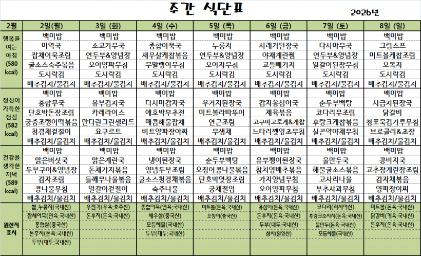 26.02.02(월)~26.02.08(일)_식단표_ 페이지 정보 작성자 관리자 작성일26-02-02 09:52 조회5회 댓글0건 다음글 목록 본문 *식단은 시장수급사정 또는 업체상황에 의해 변경될 수 있습니다.* 댓글목록 등록된 댓글이 없습니다. 다음글 목록