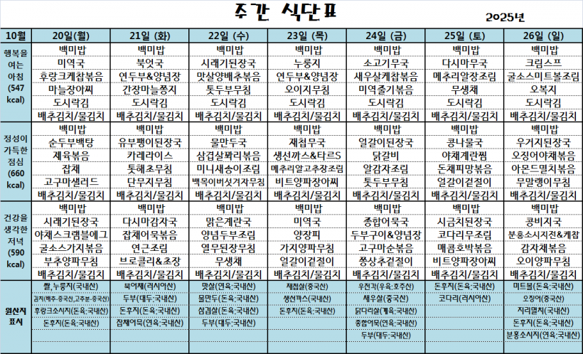 25.10.20(월)~25.10.26(일)_식단표_ 페이지 정보 작성자 관리자 작성일25-10-20 09:45 조회128회 댓글0건 이전글 다음글 목록 본문 *식단은 시장수급사정 또는 업체상황에 의해 변경될 수 있습니다.* 댓글목록 등록된 댓글이 없습니다. 이전글 다음글 목록