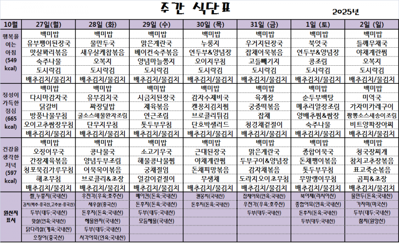 25.10.27(월)~25.11.02(일)_식단표_ 페이지 정보 작성자 관리자 작성일25-10-27 10:06 조회116회 댓글0건 이전글 다음글 목록 본문 *식단은 시장수급사정 또는 업체상황에 의해 변경될 수 있습니다.* 댓글목록 등록된 댓글이 없습니다. 이전글 다음글 목록