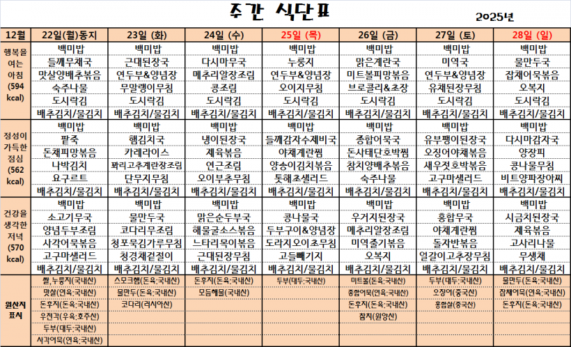 25.12.22(월)~26.1.4(일)_식단표_ 페이지 정보 작성자 관리자 작성일25-12-22 10:13 조회50회 댓글0건 이전글 다음글 목록 본문 *식단은 시장수급사정 또는 업채상황에 의해 변경될 수 있습니다.* 댓글목록 등록된 댓글이 없습니다. 이전글 다음글 목록