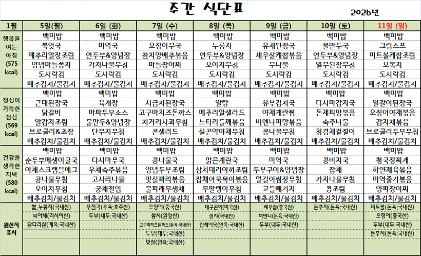 26.1.5(월)~26.1.11(일)_식단표_ 페이지 정보 작성자 관리자 작성일26-01-05 10:03 조회22회 댓글0건 이전글 다음글 목록 본문 *식단은 시장수급사정 또는 업체상황에 의해 변경될 수 있습니다.* 댓글목록 등록된 댓글이 없습니다. 이전글 다음글 목록
