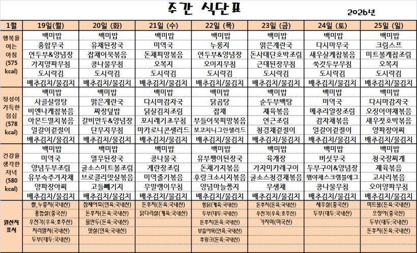 26.01.19(월)~26.01.25(일)_식단표_ 페이지 정보 작성자 관리자 작성일26-01-19 10:03 조회15회 댓글0건 이전글 다음글 목록 본문 *식단은 시장수급사정 또는 업체상황에 의해 변경될 수 있습니다.* 댓글목록 등록된 댓글이 없습니다. 이전글 다음글 목록
