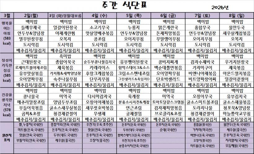 26.03.02(월)~26.03.08(일)_식단표_ 페이지 정보 작성자 관리자 작성일26-03-03 09:57 조회29회 댓글0건 이전글 다음글 목록 본문 *식단은 시장수급사정 또는 업체상황에 의해 변경될 수 있습니다.* 댓글목록 등록된 댓글이 없습니다. 이전글 다음글 목록